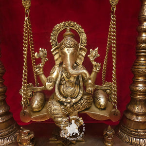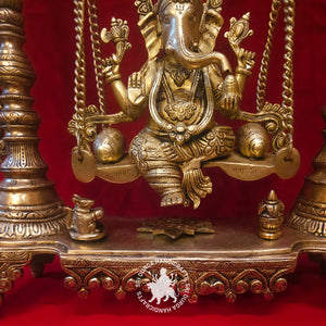 Introducing the magnificent 26-inch Lord Ganesh in Oonjal With Bells – a divine masterpiece embodying grace, auspiciousness, and spiritual fulfillment. Crafted with unparalleled artistry and devotion, this exquisite idol captures the divine presence of Lord Ganesh seated on an ornate oonjal (swing), adorned with melodious bells.