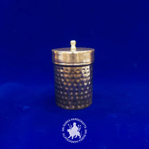 Design: Standing at a convenient 4 inches in diameter, this round box boasts a striking hammered texture that adds an earthy yet sophisticated touch. The hammered copper body captures the artisan's dedication to creating a piece that combines artistry and functionality seamlessly. The lid fits securely, preserving the contents within while enhancing its visual appeal.