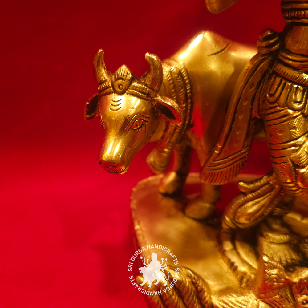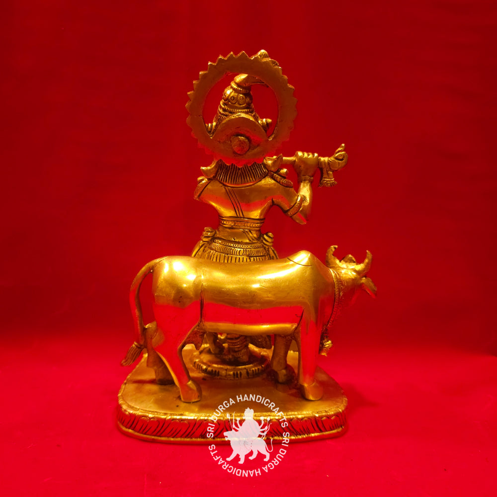 Crafted from premium brass, the Krishna with Cow Idol stands at a graceful 8 inches, making it a focal point of spiritual reverence in any home, temple, or meditation space. The intricate craftsmanship brings to life the endearing image of Lord Krishna standing alongside his cherished cow, radiating joy and divine grace.