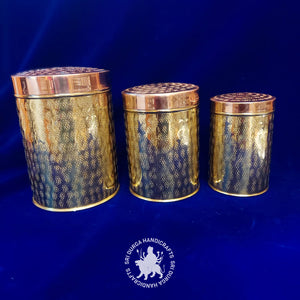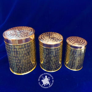 Design: This set includes three storage boxes with sizes of 8 inches, 7 inches, and 6 inches respectively. Each box features a hammered texture on the brass exterior, creating a unique and appealing visual and tactile experience. The lids fit securely, preserving the contents within while enhancing their visual appeal. The intricate detailing and craftsmanship showcase the artisan's dedication to creating truly exceptional pieces.