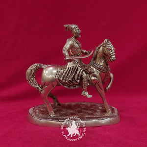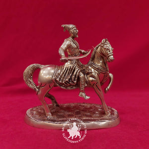 Standing at an impressive 9 inches, this idol showcases the detailed craftsmanship that brings to life the iconic image of Shivaji atop a horse, symbolizing his dynamic leadership and prowess. The high-quality brass construction and lustrous finish not only add an element of elegance but also convey the strength and resilience embodied by Shivaji.
