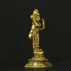 This Brass Aandal statue embodies the essence of feminine devotion and spiritual beauty. Revered as the incarnation of Bhudevi, she is believed to fulfill sincere wishes and guide devotees on a path of unconditional love toward Lord Vishnu.