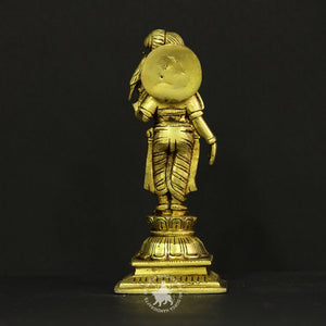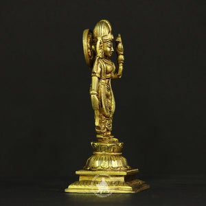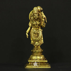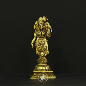 Celebrate divine love and devotion with this Brass Aandal idol. Standing 7 inches tall, she is depicted in a graceful pose with hands folded in prayer, representing unwavering bhakti to Lord Vishnu. A sacred addition to your pooja space.