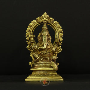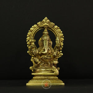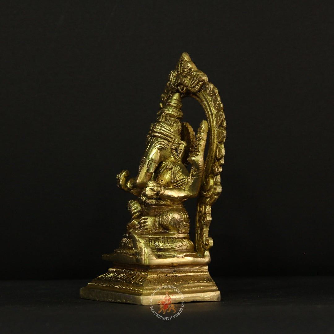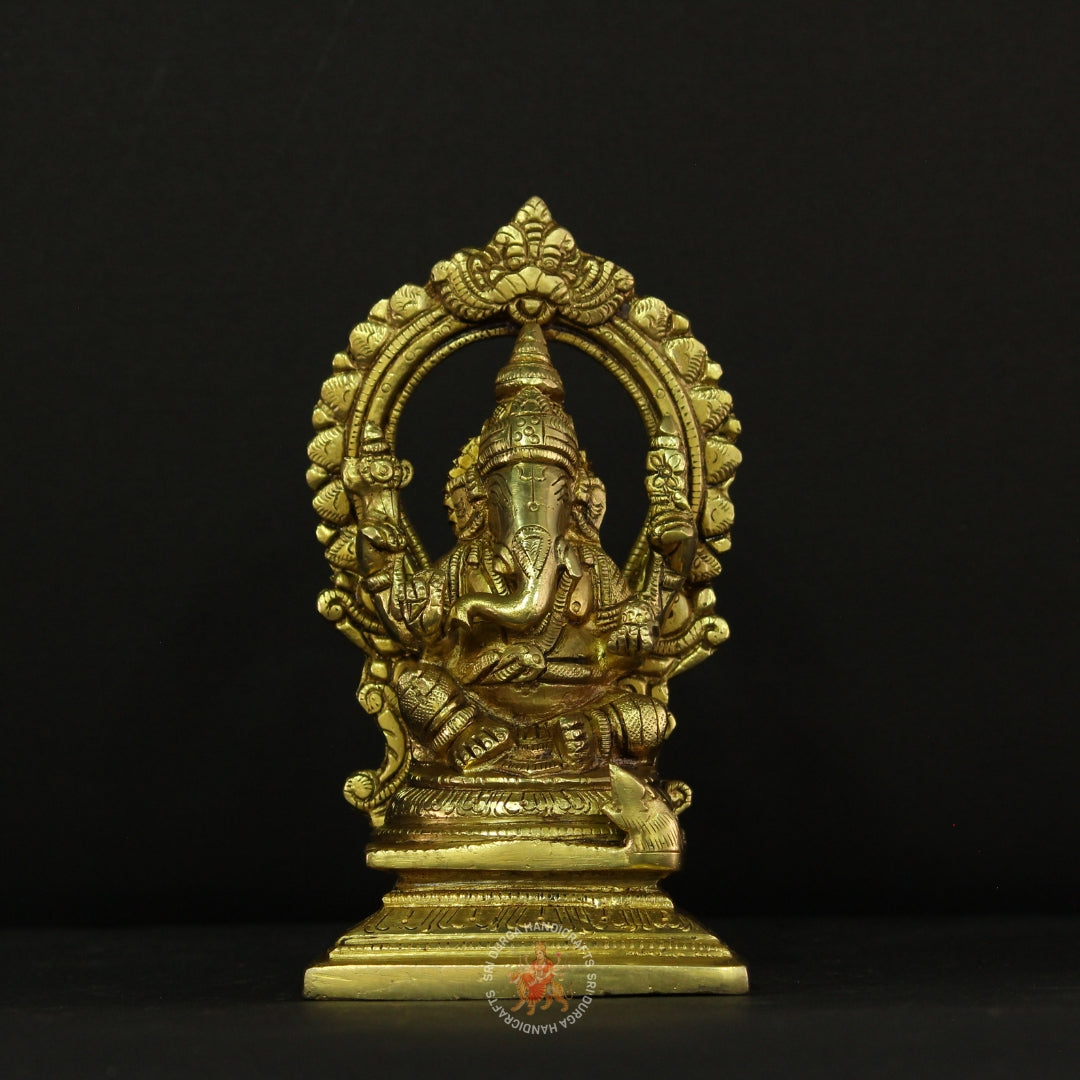 the blessings of Lord Ganesh, the Remover of Obstacles and the God of Wisdom and New Beginnings, into your home with this beautifully crafted Ganesh with Divine Thiruvatchi Idol. This exquisite brass sculpture depicts Lord Ganesh seated gracefully, surrounded by a majestic Thiruvatchi (sacred arch), symbolizing his divine aura and cosmic energy.