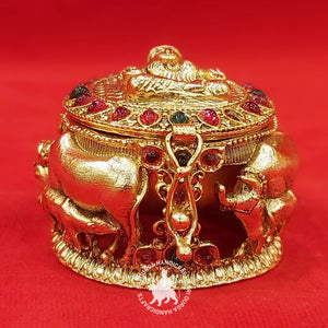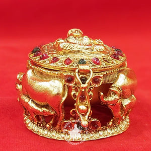 Practical Utility: Beyond its spiritual significance, the German Silver Cow Calf Lakshmi Gift Box serves as a functional container for offerings, jewelry, or special keepsakes. Its size and design make it suitable for various settings, whether displayed on your altar, dresser, or as an elegant decor piece on a shelf.