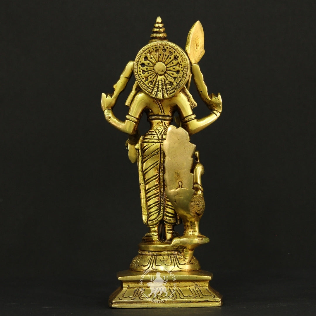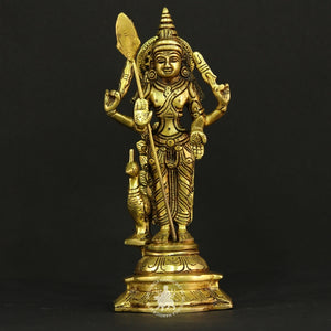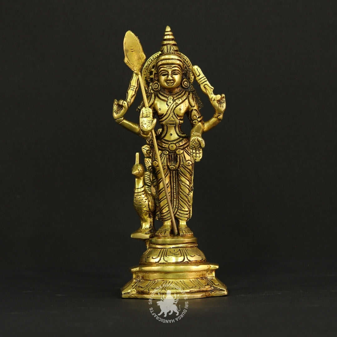 Celebrate devotion and fine artistry with this Four-Armed Brass Lord Murugan Statue, a stunning representation of the divine warrior and son of Lord Shiva. Expertly handcrafted from solid brass, this elegant idol portrays Lord Murugan in a powerful standing posture, holding his sacred Vel (spear) and other divine attributes, with one hand raised in a blessing gesture (Abhaya Mudra).
