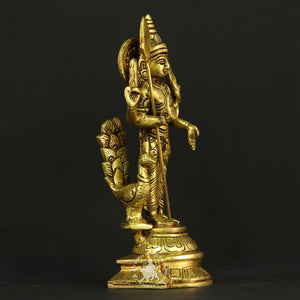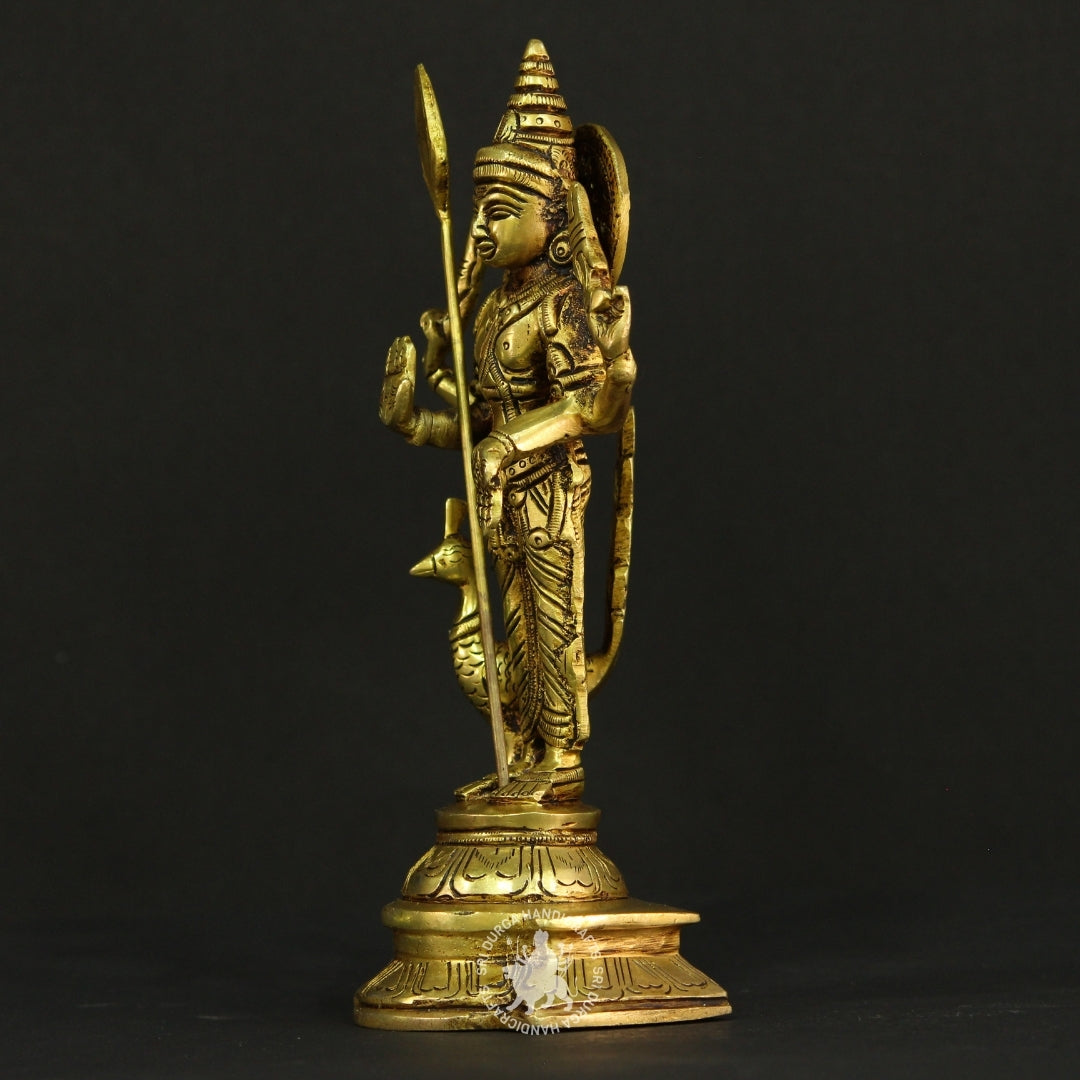 Accompanied by his loyal peacock mount at his side, this statue symbolizes victory over negativity and the triumph of spiritual wisdom. The detailed work on the attire, facial features, and ornaments reflects traditional South Indian craftsmanship, while the antique golden finish lends the sculpture a timeless aura.