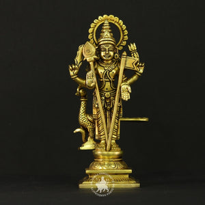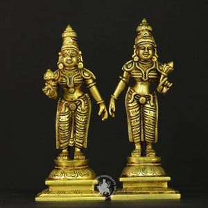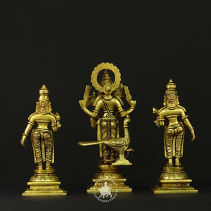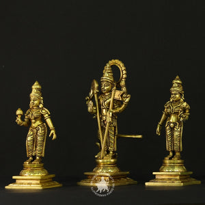 Celebrate divine unity and power with this stunning Brass Murugar, Valli & Deivanai set. Standing proudly with his Vel and peacock, Lord Murugan is flanked by his consorts, symbolizing love, wisdom, and victory. A divine centerpiece for any pooja room.