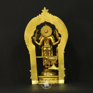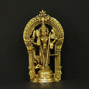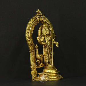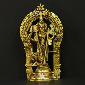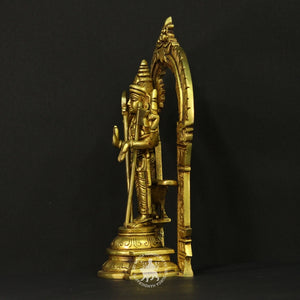 This Brass Murugar idol with Thiruvatchi is a stunning example of temple-style craftsmanship. Intricate detailing in the arch, ornaments, and the peacock make this 10-inch sculpture a visual and spiritual masterpiece.