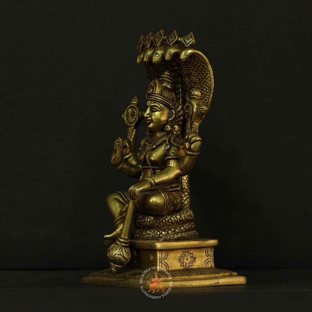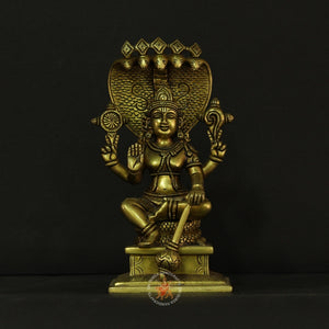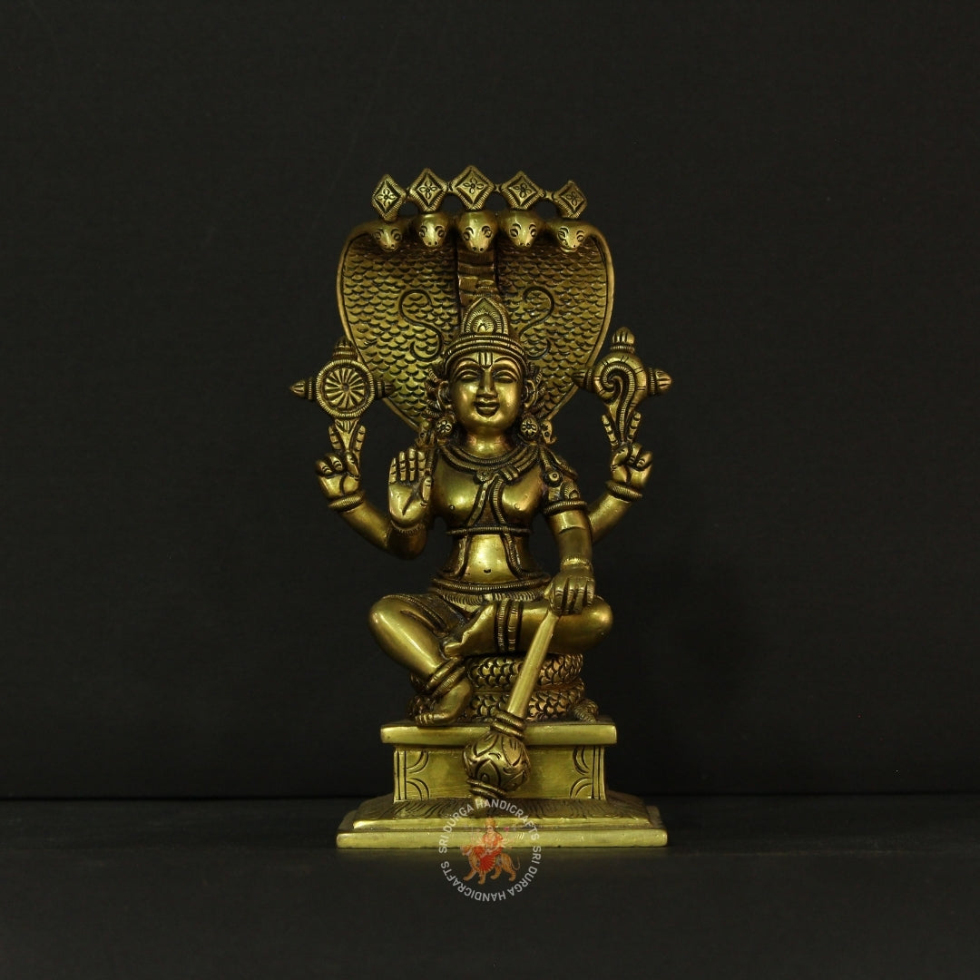 Lord Vishnu is depicted here with his four symbolic hands, holding the conch, discus, mace, and lotus, which represent his power to protect, preserve, and maintain cosmic order. The idol’s intricate detailing and the brass finish ensure a timeless, majestic appeal, making it an ideal addition to your home or sacred space to invite divine blessings of prosperity, protection, and peace.