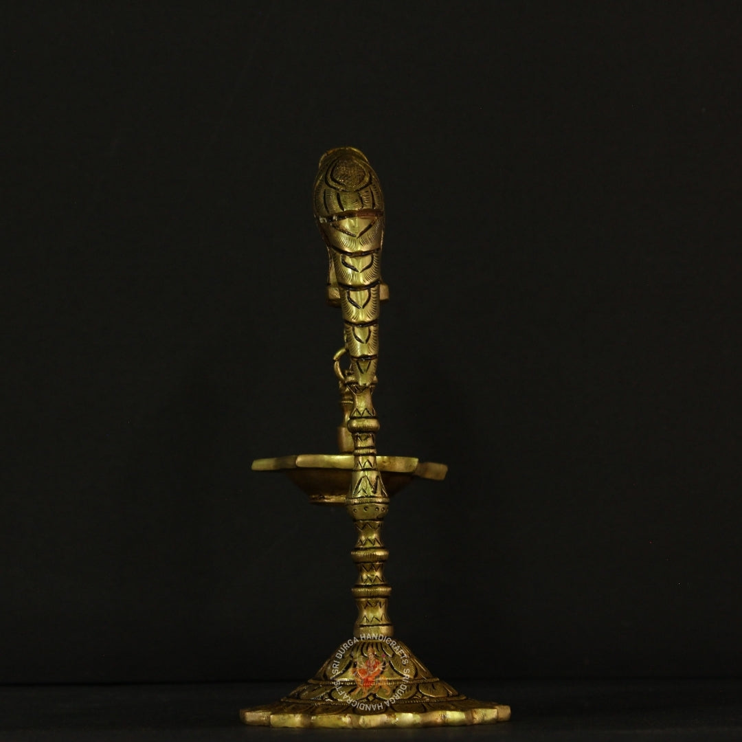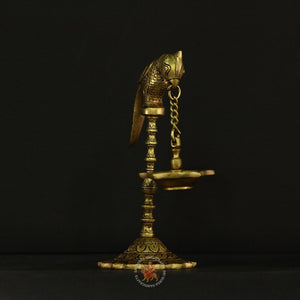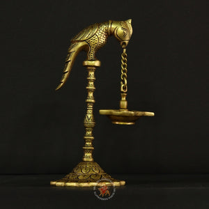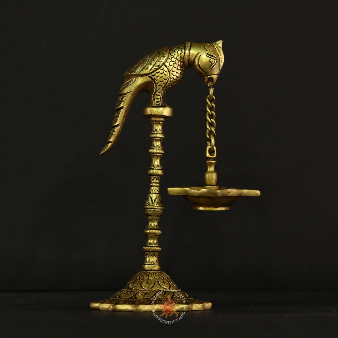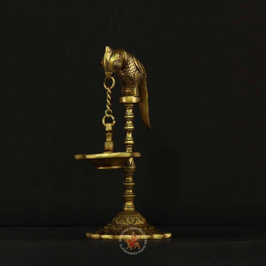 Celebrate tradition and artistry with this exquisite Brass Parrot Lamp, a graceful addition to your pooja room or festive décor. Featuring a beautifully sculpted parrot perched atop the lamp, this diya symbolizes love, fertility, prosperity, and auspicious beginnings in Indian culture. Crafted from high-quality brass, this oil lamp exudes elegance while illuminating your space with divine light and positivity.
