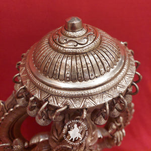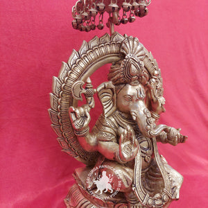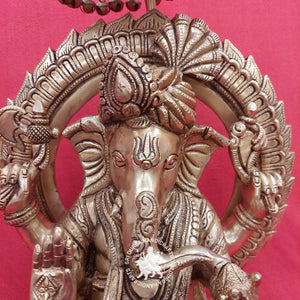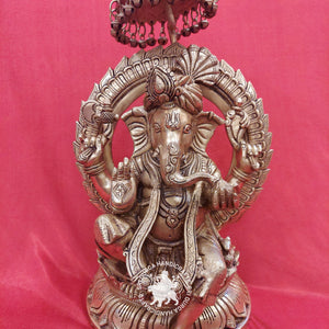 Design: The Umbrella Ganesh Brass Idol features Lord Ganesh seated majestically under a decorative umbrella, symbolizing protection, shelter, and blessings. Lord Ganesh's form is depicted with exquisite detail, from His elephant head and large ears to His four arms, each holding a symbolic object - a broken tusk, a modak (sweet), a noose, and a lotus. His lower right hand is extended in a gesture of blessings (Abhaya Mudra). The intricate detailing captures the essence of His divine grace and the symbolism of the umbrella, which represents protection from life's storms and challenges.